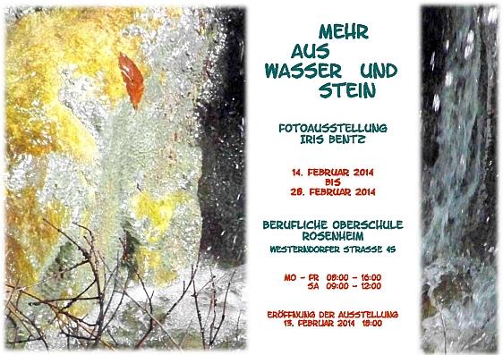 13. bis 28. Februar 2014 - Fotoausstellung von Iris Bentz"Mehr aus Wasser und Stein"war der Titel der Fotoausstellung von Iris Bentz, die an der Beruflichen Oberschule die Fächer Englisch und Französisch unterrichtet. Die Ausstellung dauerte vom 13. bis 28. Februar 2014. Mehr als die Abbildung der Elemente Wasser und Stein ließen die Fotografien oft erkennen beim Eintauchen in fantastisch verborgene Landschaften innerhalb der von außen sichtbaren Welt. |